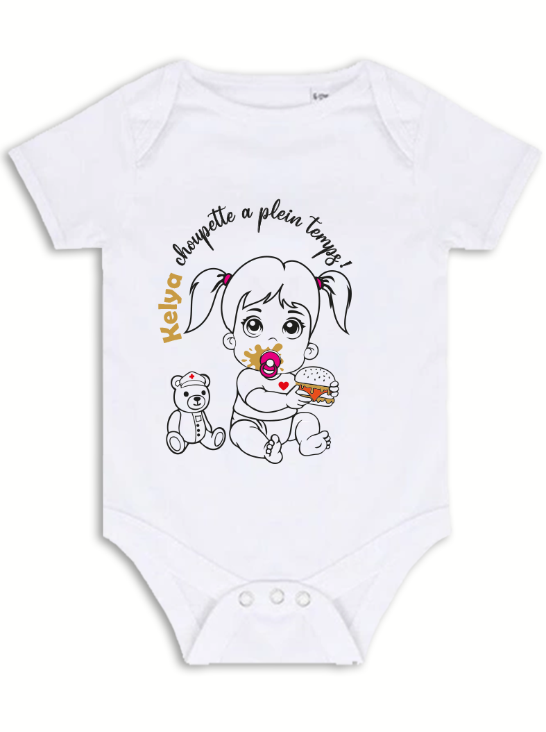 Body 100% coton blanc, papier transfert certifié OEKO-TEX Standard 100 classe 1 garantissant l’absence de substances nocives et la protection de l’environnement.
