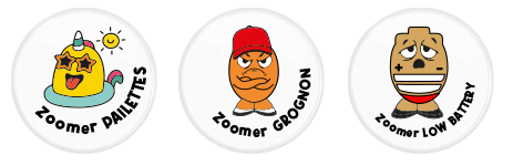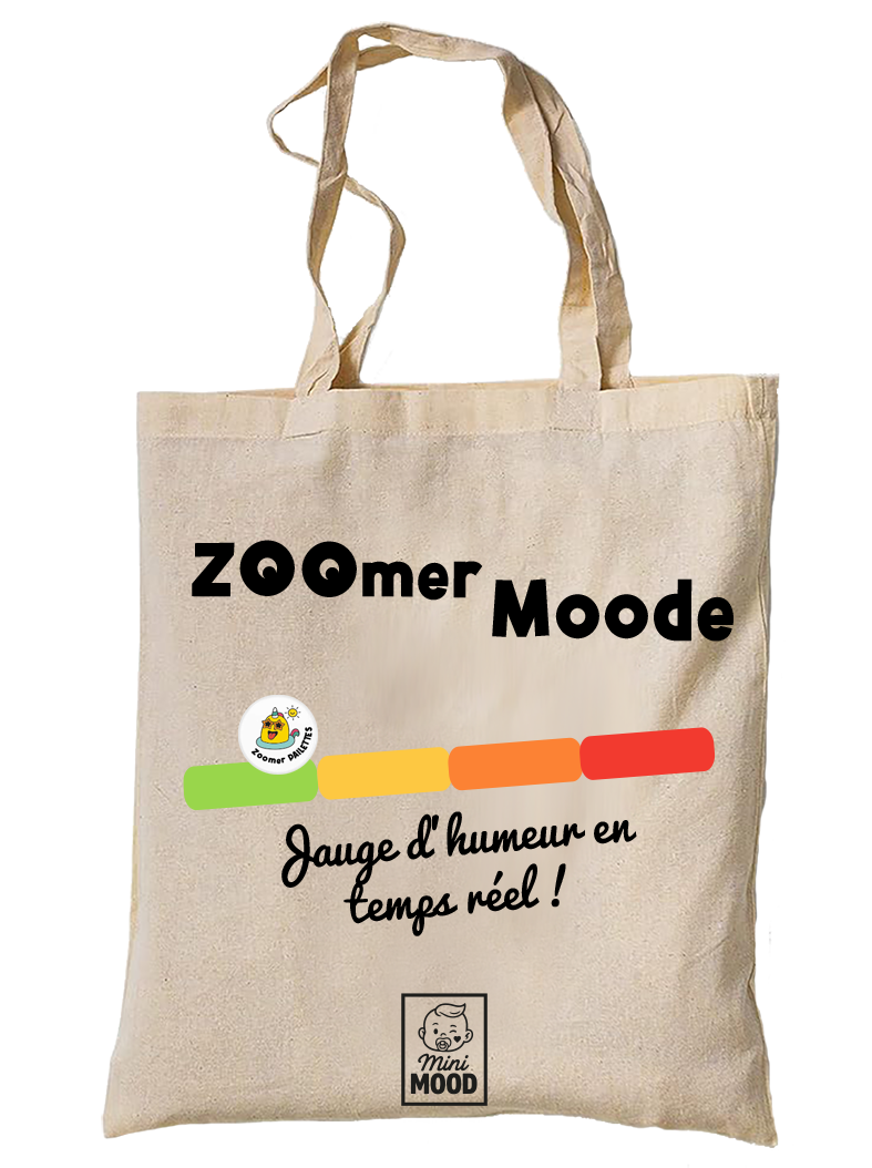 Le tote bag « Zoomer Mood » sera fourni avec 3 badges (Zoomer paillettes, Zoomer Grognon, Zoomer Chill) afin de personnaliser le sac selon vos émotions au quotidien.